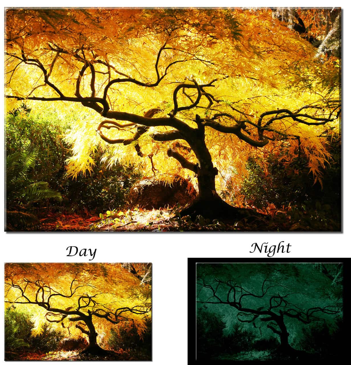 In the presence of light from either the sun or light bulbs, the print can be charged as quickly as in 30 minutes. At night or in the dark, the print will radiate a warm and discreet light. Enjoy this print any time of the day!